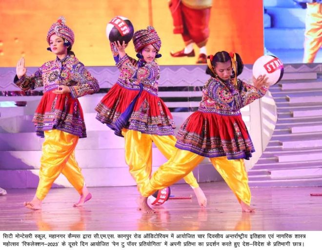सिटी मोन्टेसरी स्कूल, महानगर कैम्पस द्वारा सी.एम.एस. कानपुर रोड ऑडिटोरियम में आयोजित किए जा रहे अन्तर्राष्ट्रीय इतिहास एवं नागरिक शास्त्र महोत्सव ‘रिफलेक्शन-2023’ के दूसरे दिन आज श्रीलंका, नेपाल, बांग्लादेश, भूटान व देश के कोने-कोने से पधारे 500 से अधिक छात्रों ने विभिन्न दिलचस्प प्रतियोगिताओं के माध्यम से इतिहास व नागरिक शास्त्र के ज्ञान का जोरदार प्रदर्शन किया। देश-विदेश के प्रतिभागी छात्रों ने आज लीडरशिप लीगेसी, पेन टु पॉवर, वाद-विवाद एवं कोरियोग्राफी जैसी दिलचस्प प्रतियोगिताओं के माध्यम से इतिहास के पन्ने पलटे और कई तथ्यों पर प्रकाश डाला। विदित हो कि ‘रिफलेक्शन-2023’ का आयोजन 5 से 8 अगस्त तक सी.एम.एस. कानपुर रोड ऑडिटोरियम में किया जा रहा है।