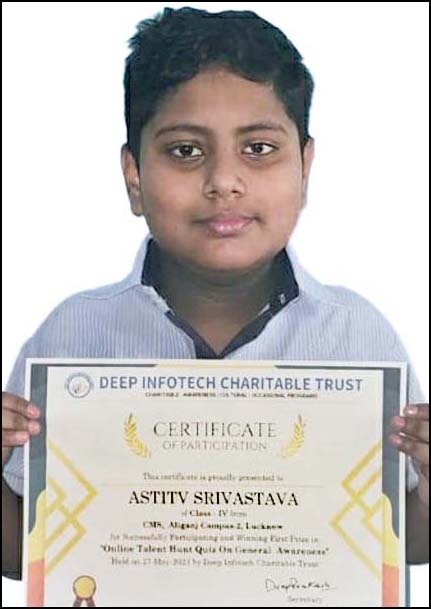 सिटी मोन्टेसरी स्कूल, अलीगंज (द्वितीय कैम्पस) के कक्षा-4 के छात्र अस्तित्व श्रीवास्तव ने जनरल अवेयरनेस पर आधारित जोनल स्तरीय क्विज प्रतियोगिता में प्रथम पुरस्कार अर्जित कर विद्यालय का नाम गौरवान्वित किया है। यह प्रतियोगिता दीप इन्फोटक चैरिटेबल ट्रस्ट के तत्वावधान में आयोजित हुई। सी.एम.एस. संस्थापक डा. जगदीश गाँधी ने विद्यालय के इस होनहार छात्र को आशीर्वाद देते हुए उसके उज्जवल भविष्य की कामना की है। प्रतियोगिता में सी.एम.एस. के इस प्रतिभाशाली छात्र ने विभिन्न सम-सामयिक विषयों से सम्बन्धित प्रश्नों के उत्तर बड़ी ही तीव्रता, स्पष्टता तथा सारगर्भित ढंग से देकर अपने ज्ञान-विज्ञान, तार्किक क्षमता व आत्मविश्वास का शानदार प्रदर्शन किया और दिखाया कि सी.एम.एस. के छात्र छोटी उम्र से ही रचनात्मक सोच व अभिव्यक्ति क्षमता में अव्वल हैं। प्रतियोगिता के आयोजकों ने अस्तित्व के ज्ञान-विज्ञान की भूरि-भूरि प्रशंसा करते हुए प्रशस्ति पत्र प्रदान कर सम्मानित किया।