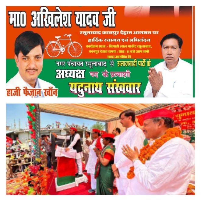 नगर पंचायत रसूलाबाद में आगामी 11 मई को होने वाले मतदान में अध्यक्ष पद के समाजवादी प्रत्याशी यदुनाथ प्रताप सिंह के लिए पूर्व मुख्यमंत्री अखिलेश यादव ने पहुंच कर जन सभा को संबोधित किया और साथ ही नगर पंचायत के मतदाताओं से साइकिल पर वोट दे, अपील करते हुए सत्ता पक्ष पर निशाना साधा एवं प्रवक्ता हाजी फैजान जिला उपाध्यक्ष समाजवादी ने अपनी ताकत का एहसास कराया।