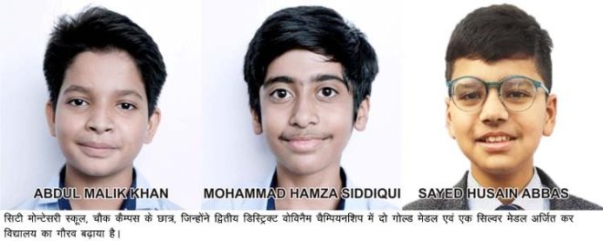 सिटी मोन्टेसरी स्कूल, चौक कैम्पस के प्रतिभाशाली छात्रों सैयद हुसैन अब्बास, अब्दुल मलिक खान एवं हमजा सिद्दीकी ने द्वितीय डिस्ट्रिक्ट वोविनैम चैम्पियनशिप में दो गोल्ड मेडल व एक सिल्वर मेडल अर्जित कर विद्यालय का गौरव बढ़ाया है। इस चैम्पियनशिप में सैयद हुसैन अब्बास, अब्दुल मलिक खान ने गोल्ड मेडल जबकि हमजा सिद्दीकी ने सिल्वर मेडल अर्जित किया है। यह जानकारी सी.एम.एस. के मुख्य जन-सम्पर्क अधिकारी श्री हरि ओम शर्मा ने दी है। श्री शर्मा ने बताया कि इस चैम्पियनशिप में चुने हुए छात्रों ने प्रतिभाग कर अपनी खेल प्रतिभा का जोरदार प्रदर्शन किया तथापि कड़ी प्रतिस्पर्धा के बीच सी.एम.एस. के इन प्रतिभाशाली छात्रों ने अपनी खेल प्रतिभा, चुस्ती-फूर्ती, कौशल तथा दमखम के बलबूते तीन मेडल अर्जित कर राष्ट्रीय व अन्तर्राष्ट्रीय स्तर पर अपनी पहचान बनाने के संकेत दिये है। श्री शर्मा ने बताया कि सी.एम.एस. छात्र न सिर्फ शैक्षिक क्षेत्र में अपितु खेलों व समाज के अन्य बहुतेरे क्षेत्रों में भी विद्यालय का नाम राष्ट्रीय व अन्तर्राष्ट्रीय स्तर पर रोशन कर रहे हैं क्योंकि सी.एम.एस. अपने छात्रों के बौद्धिक विकास के साथ उन्हें खेलों व अन्य सामाजिक क्षेत्रों के लिए भी विशेष रूप से तैयार करने में पूरे मनोयोग से संलग्न है।
