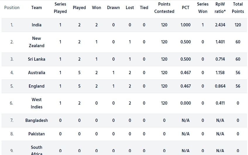 दो मैचों की सीरीज में एक मैच जीतने पर 60 प्वाइंट्स मिलते हैं। तीन मैचों की सीरीज मे एक मैच जीतने पर 40 प्वाइंट्स मिलते हैं। चार मैचों की सीरीज में एक मैच की जीत पर 30 प्वाइंट्स मिलते हैं। वहीं, पांच मैचों की सीरीज में एक मैच जीतने पर 24 प्वाइंट्स मिलते हैं। इसके अलावा एक मैच को ड्रॉ करने के लिए 8-8 अंक मिले हैं।