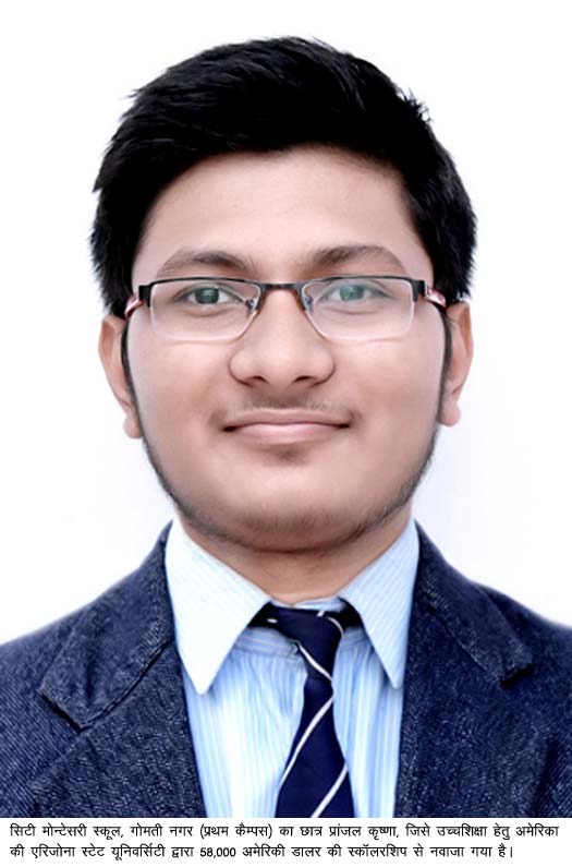 लखनऊ, 5 मई। सिटी मोन्टेसरी स्कूल, गोमती नगर (प्रथम कैम्पस) के छात्र प्रांजल कृष्णा को उच्चशिक्षा हेतु अमेरिका की एरिजोना स्टेट यूनिवर्सिटी द्वारा 58,000 अमेरिकी डालर की स्कॉलरशिप से नवाजा गया है। प्रांजल को यह स्कॉलरशिप चार वर्षीय उच्चशिक्षा अवधि के दौरान प्रदान की जायेगी।