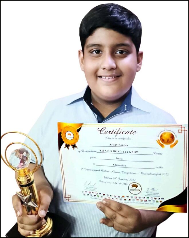 सिटी मोन्टेसरी स्कूल, अलीगंज (द्वितीय कैम्पस) के कक्षा-4 के छात्र अर्णव पाण्डेय ने इण्टरनेशनल एबेकस कम्पटीशन में चैम्पियन्स ट्राफी अर्जित कर विद्यालय का नाम गौरवान्वित किया है। यह प्रतियोगिता शैक्षिक संस्था ब्रेनोब्रेन के तत्वावधान में आयोजित ब्रेनोब्रेनफेस्ट-2022 के अन्तर्गत आयोजित की गई। सी.एम.एस. संस्थापक डा. जगदीश गाँधी ने विद्यालय के इस मेधावी छात्र के उज्जवल भविष्य की कामना की है।