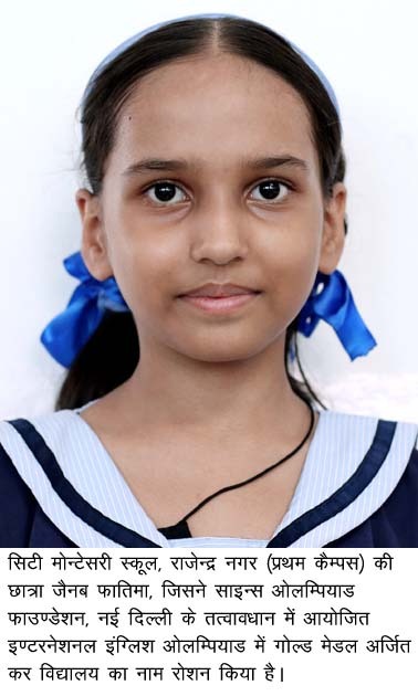 सिटी मोन्टेसरी स्कूल, राजेन्द्र नगर (प्रथम कैम्पस) की कक्षा-3 की मेधावी छात्रा जैनब फातिमा ने इण्टरनेशनल इंग्लिश ओलम्पियाड में गोल्ड मेडल अर्जित कर विद्यालय का नाम गौरवान्वित किया है। यह प्रतियोगिता साइन्स ओलम्पियाड फाउण्डेशन, नई दिल्ली के तत्वावधान में आयोजित हुई। इस अन्तर्राष्ट्रीय प्रतियोगिता में भारत समेत कई देशों केे छात्रों ने प्रतिभाग किया तथापि सी.एम.एस. राजेन्द्र नगर (प्रथम कैम्पस) की इस मेधावी छात्रा ने अपने मेधात्व व अंग्रेजी भाषा के उत्कृष्ट ज्ञान का शानदार प्रदर्शन कर विद्यालय का नाम रोशन किया है। इस उपलब्धि हेतु आयोजकों ने जैनब को गोल्ड मेडल व प्रशस्ति पत्र प्रदान कर सम्मानित किया। सी.एम.एस. संस्थापक डा. जगदीश गाँधी ने इस प्रतिभाशाली छात्रा के उज्जवल भविष्य की कामना की है। अपने प्रत्येक छात्र को मातृ भाषा हिन्दी के साथ-साथ अंग्रेजी भाषा का सर्वश्रेष्ठ ज्ञान प्रदान कर रहा है, साथ ही वैज्ञानिक युग के महत्व को स्वीकारते हुए छात्रों का दृष्टिकोण वैज्ञानिक एवं विश्वव्यापी बनाने के उद्देश्य से जोरदार प्रयास किये जा रहे हैं। इन्हीं प्रयासों की बदौलत सी.एम.एस. के मेधावी छात्रों ने अनेकों राष्ट्रीय एवं अन्तर्राष्ट्रीय स्तर की प्रतियोगिताओं में अपनी उपस्थिति दर्ज कराई हैं।