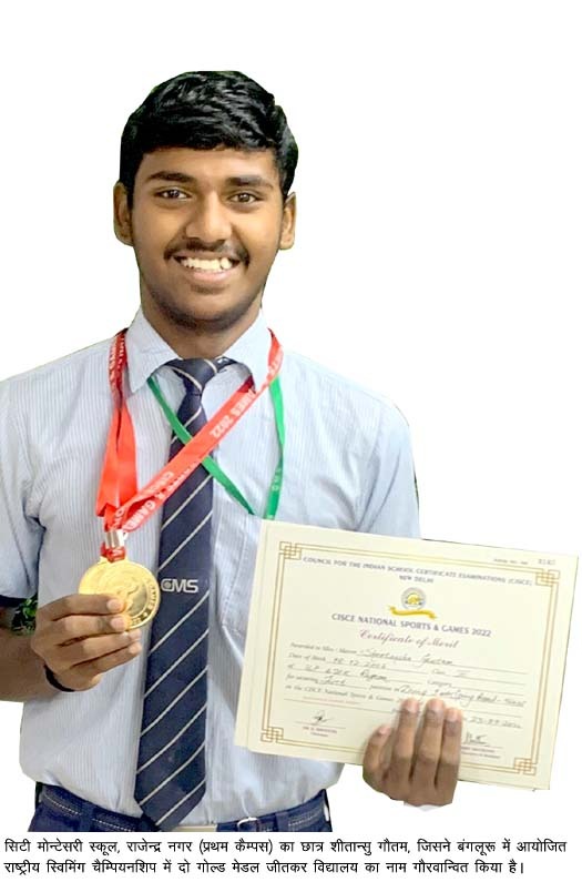 सिटी मोन्टेसरी स्कूल, राजेन्द्र नगर (प्रथम कैम्पस) के प्रतिभाशाली छात्र शीतान्सु गौतम ने बंगलूरू में राष्ट्रीय स्तर की स्विमिंग चैम्पियनशिप में दो गोल्ड मेडल जीतकर विद्यालय का गौरव बढ़ाया है। इस चैम्पियनशिप के अन्तर्गत शीतान्सु ने 1 मीटर व 3 मीटर स्प्रिंगबोर्ड डाइविंग प्रतियोगिता में स्वर्ण पदक जीता है।