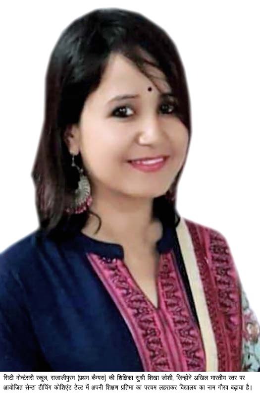 सिटी मोन्टेसरी स्कूल, राजाजीपुरम (प्रथम कैम्पस) की शिक्षिका सुश्री शिखा जोशी ने अखिल भारतीय स्तर पर आयोजित सेन्टा टीचिंग कोशिएंट टेस्ट (सेन्टा टी.क्यू.) में अपनी शिक्षण प्रतिभा व प्रोफेशनल कौशल का परचम लहराकर लखनऊ का नाम रोशन किया है। यह प्रतियोगिता सेन्टर फॉर टीचर एक्रिडिटेशन (सेन्टा) के तत्वावधान में आयोजित हुई। इस प्रतियोगिता में सुश्री शिखा जोशी ने क्लासरूम कम्युनिकेशन स्किल्स में पूरे 100 प्रतिशत अंक अर्जित कर शिक्षण प्रतिभा का सर्वोत्कृष्ट प्रदर्शन किया है। प्रतियोगिता के अन्तर्गत प्रतिभागी शिक्षकों को तीन मुख्य मानकों सब्जेक्ट एक्पर्टाइज, क्लासरूम कम्युनिकेशन एवं एलीमेन्ट्स ऑफ वर्बल कम्युनिकेशन पर आँका गया। इस उल्लेखनीय सफलता हेतु सी.एम.एस. संस्थापक डा. जगदीश गाँधी ने सुश्री शिखा जोशी को बधाई दी है।