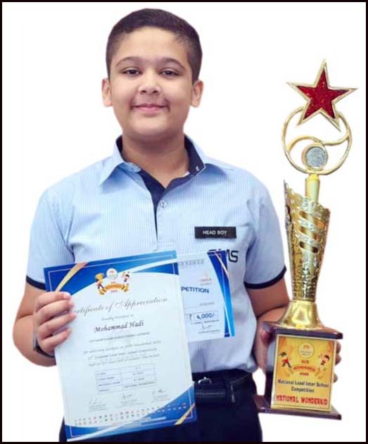 सिटी मोन्टेसरी स्कूल, चौक कैम्पस के कक्षा-5 के मेधावी छात्र मोहम्मद हादी ने अखिल भारतीय स्तर पर आयोजित ‘ब्रेनोब्रेन वण्डरकिड्स कम्पटीशन’ में अपने शानदार प्रदर्शन से ‘नेशनल वण्डरकिड’ खिताब अर्जित कर लखनऊ का गौरव सारे देश में बढ़ाया है।