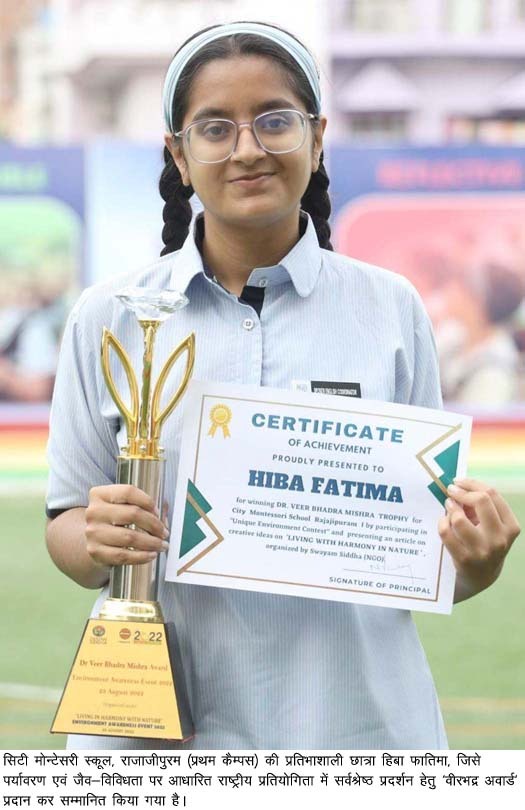सिटी मोन्टेसरी स्कूल, राजाजीपुरम (प्रथम कैम्पस) की कक्षा-11 की प्रतिभाशाली छात्रा हिबा फातिमा ने पर्यावरण एवं जैव-विविधता पर आधारित अखिल भारतीय प्रतियोगिता में सर्वश्रेष्ठ प्रदर्शन कर लखनऊ का गौरव बढ़ाया है। इस उल्लेखनीय उपलब्धि हेतु हिबा फातिमा को ‘वीरभद्र अवार्ड’ प्रदान कर सम्मानित किया गया है। प्रतियोगिता का आयोजन सामाजिक संस्था ‘स्वयं सिद्धा’ के तत्वावधान में राष्ट्रीय स्तर पर किया गया।