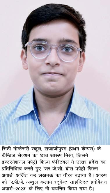 सिटी मोन्टेसरी स्कूल, राजाजीपुरम (प्रथम कैम्पस) के कैम्ब्रिज सेक्शन के कक्षा 6 के छात्र आरूष मिश्रा ने इण्टरनेशनल पपेट्री फिल्म फेस्टिवल में उत्तर प्रदेश का प्रतिनिधित्व करते हुए विज्ञान पर आधारित सर्वश्रेष्ठ कठपुतली फिल्म हेतु प्रथम पुरस्कार अर्जित कर लखनऊ का गौरव बढ़ाया है। इस उपलब्धि हेतु आरूष को ‘सर जे.सी. बोस पपेट्री फिल्म अवार्ड’ से नवाजा गया है, साथ ही ‘डा. ए.पी.जे. अब्दुल कलाम स्टूडेन्ट साइन्टिस्ट इनोवेशन अवार्ड-2023’ हेतु नामित किया गया है। इस अवसर पर इसरो पी.आर.एल. अहमदाबाद के वैज्ञानिक डा. प्रभाकर शर्मा एवं नेशनल काउन्सिल ऑफ रिसर्च टीचर साइन्टिस्ट इंडिया के चेयरमैन श्री अंजिन बानिक समेत कई वैज्ञानिकों व विद्वानों ने अपनी उपस्थिति दर्ज करायी। सी.एम.एस. संस्थापक डा. जगदीश गाँधी ने आरूष की बहुमुखी प्रतिभा की भूरि-भूरि प्रशंसा करते हुए उसके उज्जवल भविष्य की कामना की है। यह जानकारी सी.एम.एस. के मुख्य जन-सम्पर्क अधिकारी श्री हरि ओम शर्मा ने दी है।