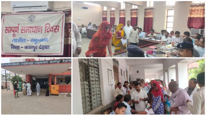 कानपुर देहात, रसूलाबाद तहसील सभागार में एसडीएम की अध्यक्षता में संपूर्ण समाधान दिवस का आयोजन किया गया जहां शिकायती पत्र लेकर पहुंचे फरियादियों की समस्याओ को सुनकर निस्तारण के लिए संबंधित अधिकारियों को निर्देशित किया गया इस मौके पर विभिन्न विभागों के अधिकारीगण मौजूद रहे।