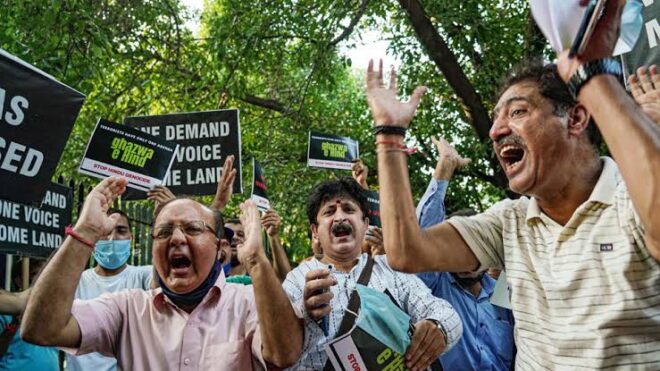 दिल्ली के जंतर-मंतर पर कश्मीरी पंडितों ने प्रदर्शन किया. कश्मीरी पंडित समुदाय की मांग है कि कश्मीर में पंडितों के नरसंहार को मान्यता दी जाए और इसपर जल्द एसआईटी गठित कर दोषियों को तुरंत फांसी की सजा दी जाए. दरअसल, फिल्म ‘द कश्मीर फाइल्स’ रिलीज होने के बाद से ही कश्मीरी पंडितों ने अपने लिए न्याय की आवाज बुलंद कर दी है. जम्मू-कश्मीर में 1990 के दशक में कश्मीरी पंडितों के साथ हुए अत्याचारों और पलायन पर कश्मीरी पंडित आक्रोश में हैं और सरकार से जल्द न्याय की मांग कर रहे हैं.