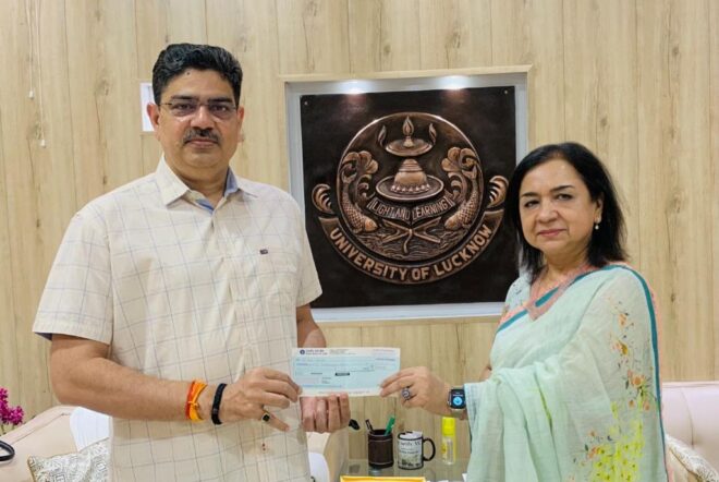 लखनऊ विश्वविद्यालय के कुलपति प्रो. आलोक कुमार राय द्वारा हाल ही में शुरू किये गए जरूरतमंद छात्रों के लिए वीसी केयर फण्ड में योगदान के लिए समाज के अनेक प्रबुद्धजन आगे आये हैं । इसी क्रम में काशी की महिला रोग विशेषज्ञ डॉ. नीलम ओहरी, लखनऊ विश्वविद्यालय के सेवानिवृत्त प्रोफेसर और प्रख्यात रंगकर्मी राज बिसारिया, आधुनिक भारतीय इतिहास विभाग के सेवानिवृत्त प्रोफेसर अरूप चक्रवर्ती और प्रो. एबी राय वरिष्ठ वैज्ञानिक इण्डियन इंस्टीट्यूट ऑफ वेजिटेबल रिसर्च वाराणसी ने वीसी केयर फण्ड हेतु सहयोग राशि का चेक कुलपति प्रो.आलोक कुमार राय को सौपा ।