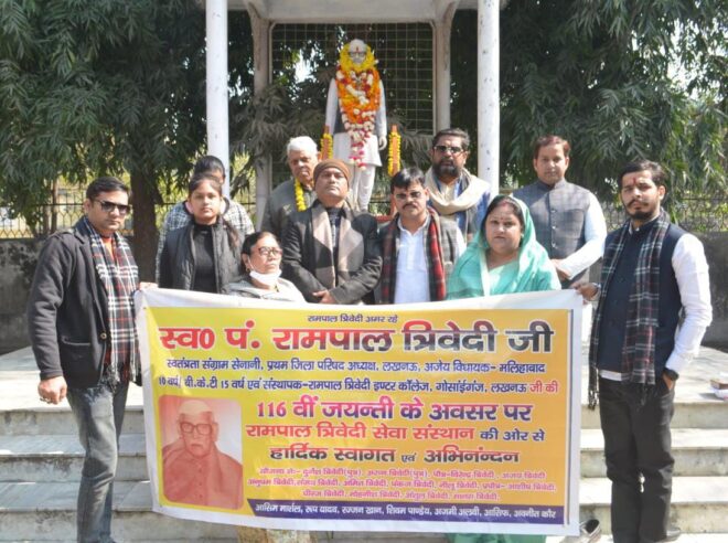 रामपाल त्रिवेदी सेवा संस्थान द्वारा स्वतंत्रता संग्राम सेनानी,पूर्व विधायक व संस्थापक रामपाल त्रिवेदी इन्टर कॉलेज, गोसाईगंज, लखनऊ में स्व. पंडित रामपाल त्रिवेदी जी की 116वीं जयंती के अवसर पर पंडित जी की प्रतिमा पर माल्यार्पण कर पंडित जी को श्रद्धांजलि अर्पित की गई व मिठाई वितरण किया गया।