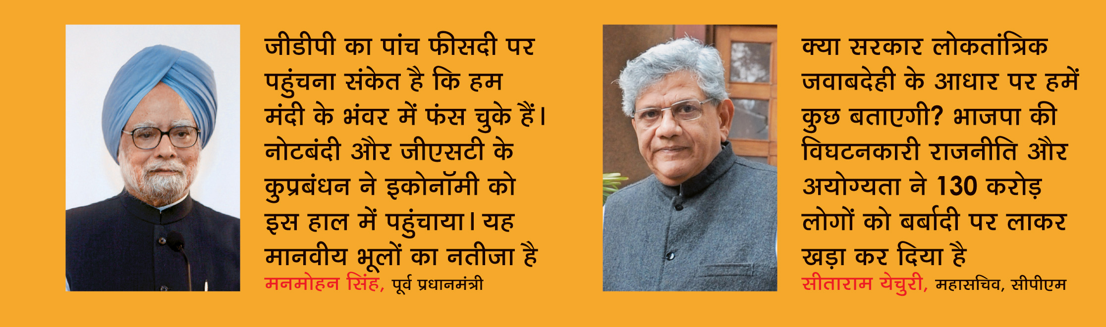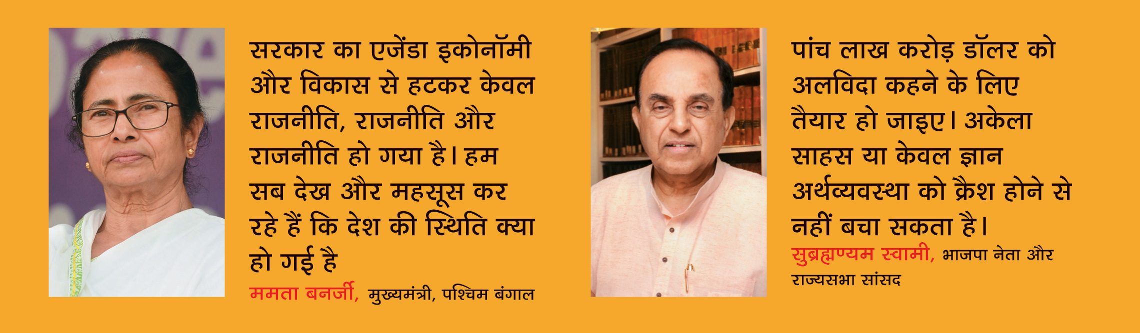 हालत यह है कि भारतीय जनता पार्टी के ही वरिष्ठ नेता और अर्थशास्त्री सुब्रह्मण्यम स्वामी ने यहां तक कह दिया, “पांच लाख करोड़ डॉलर की इकोनॉमी को अलविदा कहने के लिए तैयार हो जाओ।” गहराते संकट का एहसास और पैमाना इतना डरावना है कि आंकड़े जारी होने के पहले ही प्रधानमंत्री नरेंद्र मोदी से लेकर वित्त मंत्री निर्मला सीतारमण तक डैमेज कंट्रोल में जुट गए। प्रधानमंत्री ने 15 अगस्त को लाल किले से कॉरपोरेट जगत को “वेल्थ क्रिएटर” का नाम देकर निराशा में डूबे कारोबारियों में उत्साह भरने की कोशिश की। वित्त मंत्री ने 23 अगस्त को विदेशी निवेशकों को लुभाने के लिए अपने बजट में किए कैपिटल गेन पर सरचार्ज के ऐलान को वापस लिया और ऑटो सेक्टर में मांग बढ़ाने, छोटे कारोबारियों को जीएसटी रिफंड मिलने में आ रही दिक्कतों को दूर करने के कुछ उपायों और बैंकों को जल्द 70 हजार करोड़ रुपये देने जैसे कदमों की घोषणा की। उनकी करीब 100 मिनट की प्रेस कॉन्फ्रेंस में वह जोश गायब था, जो बजट पेश करते वक्त था।