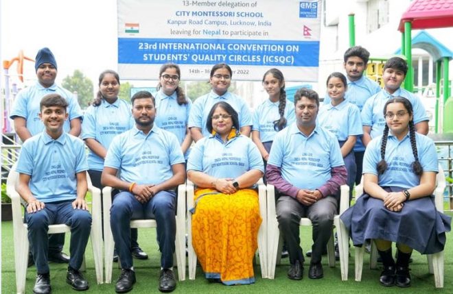 सिटी मोन्टेसरी स्कूल, कानपुर रोड कैम्पस का 13 सदस्यीय दल नेपाल में आयोजित हो रहे ‘इण्टरनेशनल कन्वेन्शन ऑन स्टूडेन्ट्स क्वालिटी सर्किल (आईसीएसक्यूसी)’ में प्रतिभाग करेगा। यह अन्तर्राष्ट्रीय सम्मेलन वर्ल्ड काउन्सिल आफ टोटल क्वालिटी एण्ड एक्सीलेन्स इन एजुकेशन (डब्ल्यू.सी.टी.क्यू.ई.ई.) के तत्वावधान में 14 से 16 अक्टूबर आयोजित किया जा रहा है, जिसमें विश्व के कई देशों के छात्र दल एवं क्वालिटी विशेषज्ञ प्रतिभाग कर रहे हैं। यह अन्तर्राष्ट्रीय क्वालिटी सर्किल सम्मेलन बदलते विश्व परिदृश्य के अनुरूप छात्रों को तैयार करने एवं उनमें समस्याओं का सकारात्मक समाधान खोजने, विश्लेषण दक्षता का विकास, टीम वर्क, सृजनात्मक क्षमता का सदुपयोग तथा विन-विन एटिट्यूट विकसित करने में मददगार साबित होगा। सी.एम.एस. संस्थापक डा. जगदीश गाँधी ने नेपाल जाने वाले विद्यालय के छात्रों व शिक्षकों को शुभकामनाएं दी हैं।