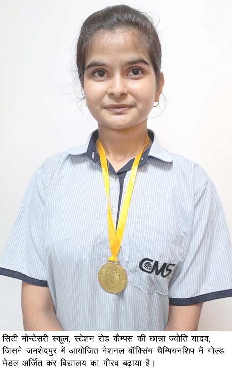 सिटी मोन्टेसरी स्कूल, स्टेशन रोड कैम्पस की कक्षा-11 की प्रतिभाशाली छात्रा ज्योति यादव ने जमशेदपुर में आयोजित नेशनल बॉक्सिंग चैम्पियनशिप में गोल्ड मेडल जीतकर अपनी खेल प्रतिभा का परचम लहराया है एवं विद्यालय का नाम गौरवान्वित किया है। प्रतियोगिता का आयोजित काउन्सिल फॉर इण्डियन स्कूल सार्टिफिकेट एक्जामिनेशन (सी.आई.एस.सी.ई.) के तत्वावधान में किया गया। सी.एम.एस. संस्थापक डा. जगदीश गाँधी ने ज्योति के उज्जवल भविष्य की कामना की है। यह जानकारी सी.एम.एस. के मुख्य जन-सम्पर्क अधिकारी श्री हरि ओम शर्मा ने दी है। श्री शर्मा ने बताया कि इस चैम्पियनशिप में देश के विभिन्न प्रतिष्ठित विद्यालयों के चुने हुए छात्रों ने प्रतिभाग कर अपनी खेल प्रतिभा का जोरदार प्रदर्शन किया तथापि कड़ी प्रतिस्पर्धा के बीच सी.एम.एस. स्टेशन रोड कैम्पस की इस प्रतिभाशाली छात्रा ने अपने दमखम व उत्कृष्ट तकनीक की बदौलत शानदार प्रदर्शन कर गोल्ड मेडल जीतने का गौरव हासिल किया। श्री शर्मा ने बताया कि सी.एम.एस. अपने छात्रों के बौद्धिक विकास के साथ उन्हें खेलों व अन्य सामाजिक क्षेत्रों के लिए भी विशेष रूप से तैयार करने में पूरे मनोयोग से संलग्न है। यही कारण है कि सी.एम.एस. छात्र न सिर्फ शैक्षिक क्षेत्र में अपितु खेलों व समाज के अन्य बहुतेरे क्षेत्रों में भी विद्यालय का नाम राष्ट्रीय व अन्तर्राष्ट्रीय स्तर पर रोशन कर रहे हैं।
