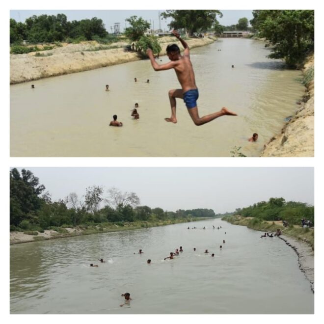वहीं ताजा नज़ारा आप ख़ुद देख सकते है कि नहर में डुबकी लगा रहे हैं लोग, बिजली की खपत भी बढ़ी, गर्मी से बचने के लिए एक तरफ लोग जहां घरों में दुबकने पर मजबूर हो गए हैं, वहीं दूसरी तरफ ग्रामीण अंचल के लोग नियमों को तोड़कर नहरों में डुबकी लगाते दिख रहे है।