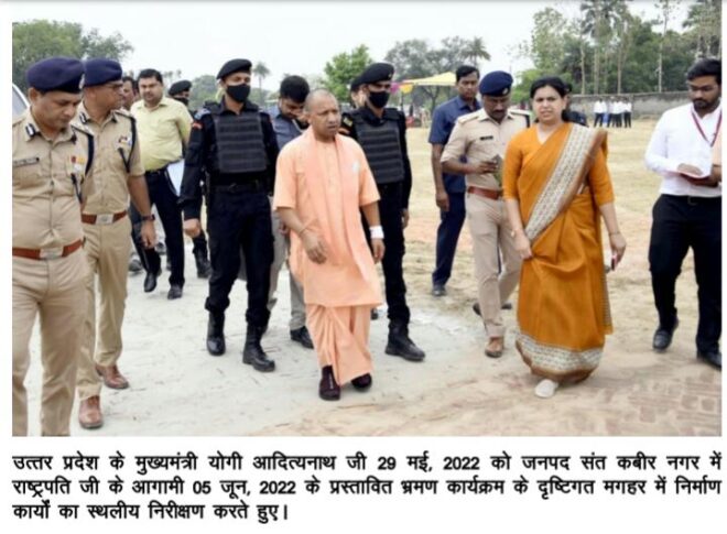 उत्तर प्रदेश के मुख्यमंत्री योगी आदित्यनाथ ने आज जनपद संत कबीर नगर में राष्ट्रपति श्री रामनाथ कोविंद जी के आगामी 05 जून, 2022 के प्रस्तावित भ्रमण कार्यक्रम के दृष्टिगत मगहर में निर्माण कार्यों का स्थलीय निरीक्षण कर तैयारियों एवं व्यवस्थाओं का जायजा लिया।