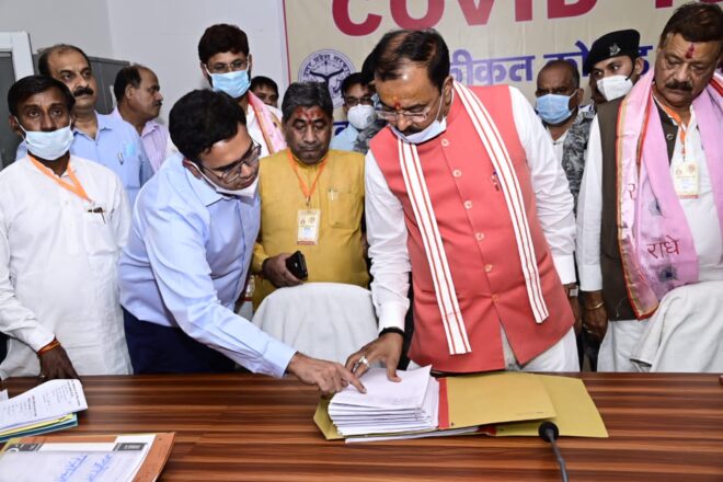 श्री मौर्य ने जनपद मथुरा के कलेक्ट्रेट परिसर सभागार में उत्तर प्रदेश सरकार के दूसरे कार्यकाल की कार्य योजना एवं “हर घर के द्वार पर सरकार” के विषय पर प्रेस वार्ता की।