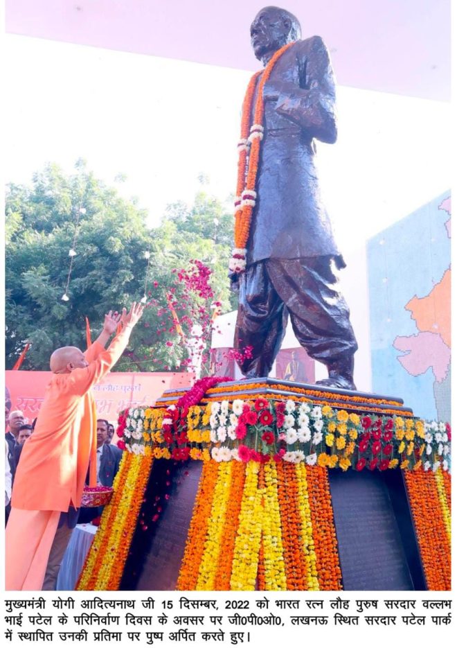 उत्तर प्रदेश के मुख्यमंत्री योगी आदित्यनाथ ने भारत रत्न लौह पुरुष सरदार वल्लभ भाई पटेल के परिनिर्वाण दिवस के अवसर पर आज यहां जी0पी0ओ0 स्थित सरदार पटेल पार्क में स्थापित उनकी प्रतिमा पर माल्यार्पण कर श्रद्धांजलि अर्पित की।