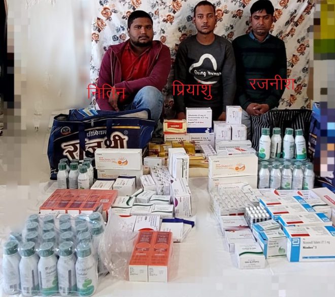 पकड़े गए अभ्युक्तो के पास से भारी मात्रा में सरकारी दवाईयाँ बरामद।