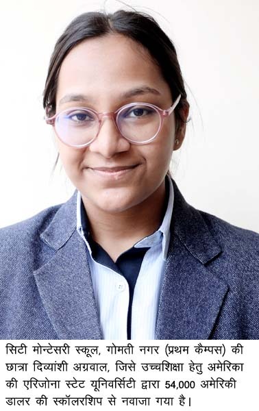 सिटी मोन्टेसरी स्कूल, गोमती नगर (प्रथम कैम्पस) की छात्रा दिव्यांशी अग्रवाल को उच्चशिक्षा हेतु अमेरिका की एरिजोना स्टेट यूनिवर्सिटी द्वारा 54,000 अमेरिकी डालर की स्कॉलरशिप से नवाजा गया है। दिव्यांशी को यह स्कॉलरशिप चार वर्षीय उच्चशिक्षा अवधि के दौरान प्रदान की जायेगी। दिव्यांशी ने इस सफलता का श्रेय सी.एम.एस. के अपने शिक्षकों व विद्यालय के शान्तिपूर्ण शैक्षिक वातावरण को दिया है। सी.एम.एस. संस्थापक डा. जगदीश गाँधी ने सी.एम.एस. छात्रा की सफलता पर प्रसन्नता व्यक्त करते हुए उसके उज्जवल भविष्य की कामना की है। श्री शर्मा ने बताया कि सी.एम.एस. प्रदेश में एकमात्र एस.ए.टी. (सैट) एवं एडवान्स प्लेसमेन्ट (ए.पी.) टेस्ट सेन्टर है जो उत्तर प्रदेश एवं आसपास के अन्य राज्यों के छात्रों को विश्व के सर्वश्रेष्ठ विश्वविद्यालयों में स्कॉलरशिप के साथ उच्च शिक्षा प्राप्त करने में मदद कर रहा है।