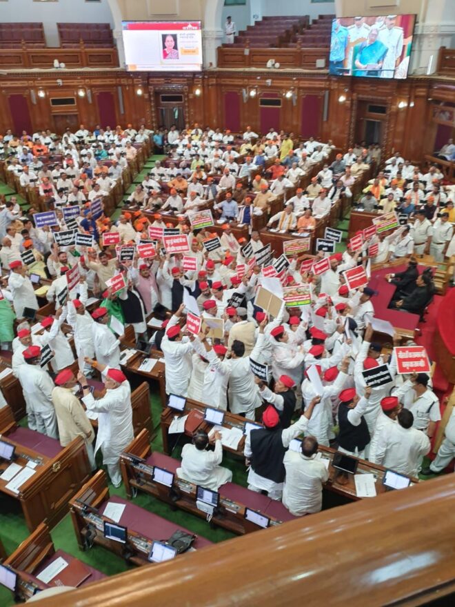 समाजवादी पार्टी एवं आर एल डी विधायकों ने नारेबाजी करते हुए राज्यपाल वापस जाओ, नारे लगाए एवं पोस्टर बैनर लेकर प्रदर्शन किया l प्रदर्शन पर खास बात यह रही प्रदर्शन करते देख कई बार मुख्यमंत्री योगी आदित्यनाथ मुस्कुराते दिखे.
