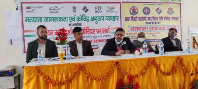 अटल बिहारी वाजपेई नगर निगम डिग्री कॉलेज सुरेंद्र नगर लखनऊ में नेहरू युवा केंद्र एवं राष्ट्रीय सेवा योजना के संयुक्त तत्वाधान में स्वीप कार्यक्रमों के तहत मतदाता जागरूकता अभियान तथा एकदिवसीय कैरियर काउंसलिंग कार्यक्रम का आयोजन किया गया, कार्यक्रम का शुभारंभ मुख्य अतिथि मुख्य विकास अधिकारी लखनऊ अश्विनी कुमार पांडे आई.ए.एस द्वारा दीप प्रज्वलित कर किया गया।
